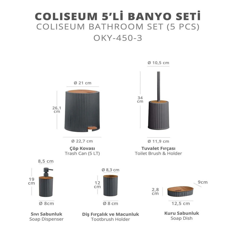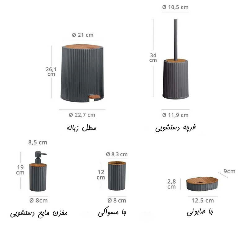 سطل زباله : 22.7*21*26.1 فرچه دستشویی : 10.5*119*34 مخزن مایع دستشویی : 8*8.5*19 جامسواکی : 8.3*8*12 جا صابونی : 9*912.5*2.8