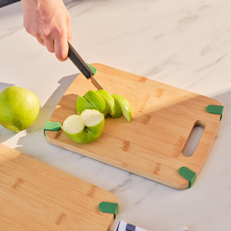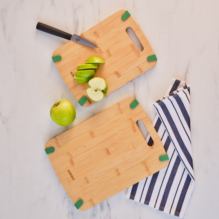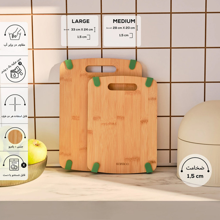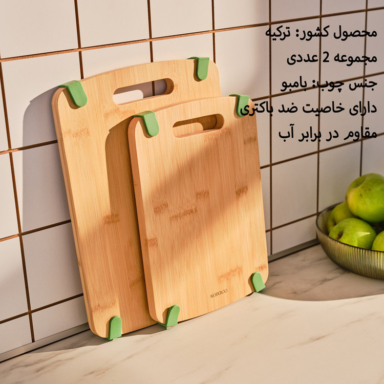 تخته برش کاراجا مدل Alcin - مجموعه 2 عددی - جنس چوب: بامبو - محصول کشور: ترکیه - مجموعه ۲ عددی - ابعاد سایز متوسط: 28x20x1.5 - ابعاد سایز بزرگ: 33x24x1.5 - دارای خاصیت ضد باکتری - مقاوم در برابر آب - عدم تاپ خوردگی هنگام خیس شدن