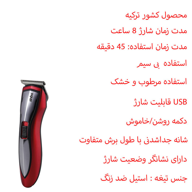 مدت زمان شارژ 8 ساعت - مدت زمان استفاده: 45 دقیقه - استفاده بی سیم - استفاده مرطوب و خشک - تیغه فولادی ضدزنگ - شانه جداشدنی با طول برش متفاوت - دکمه روشن/خاموش - دارای نشانگر وضعیت شارژ -