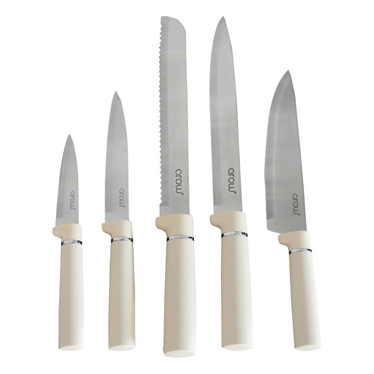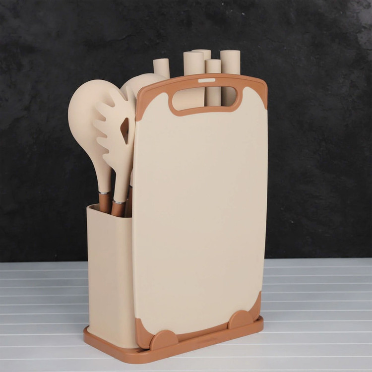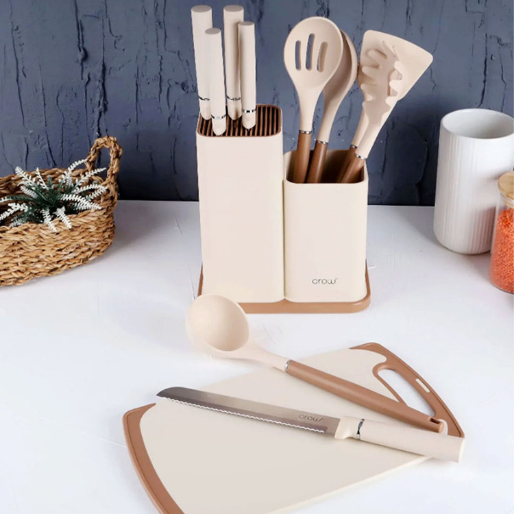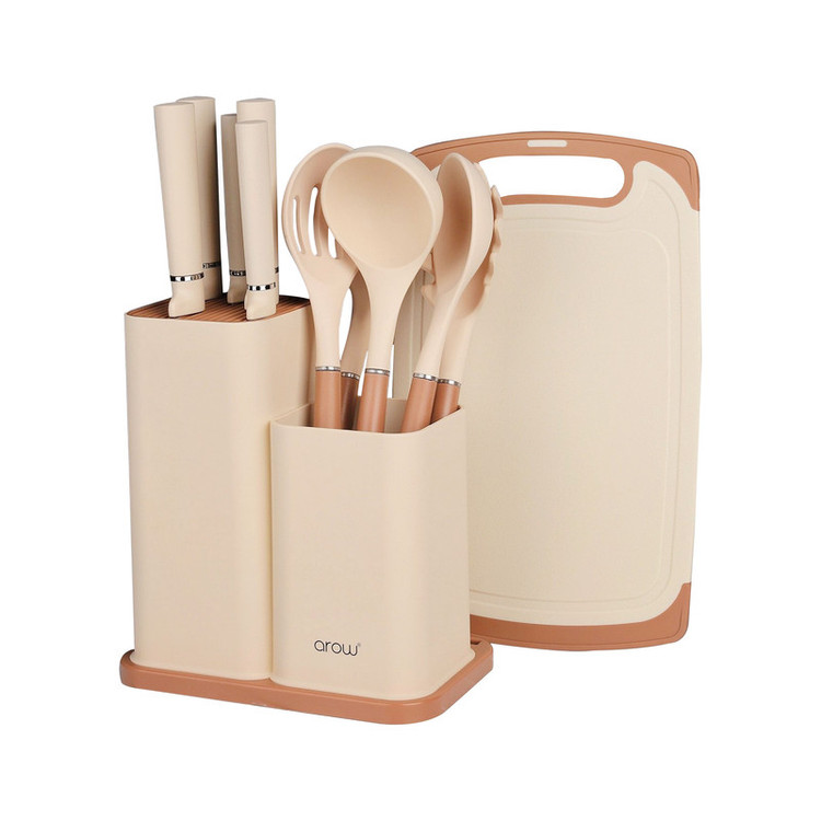 محصول 12 پارچه دارای : چاقوی برش گوشت - چاقوی برش نان - چاقوی همه کاره - چاقوی آشپزخانه - چاقوی میوه خوری - ملاقه شیاردار - ملاقه - قاشق پخت و پز - ملاقه پاستا - سرخ کن - تخته برش - استند