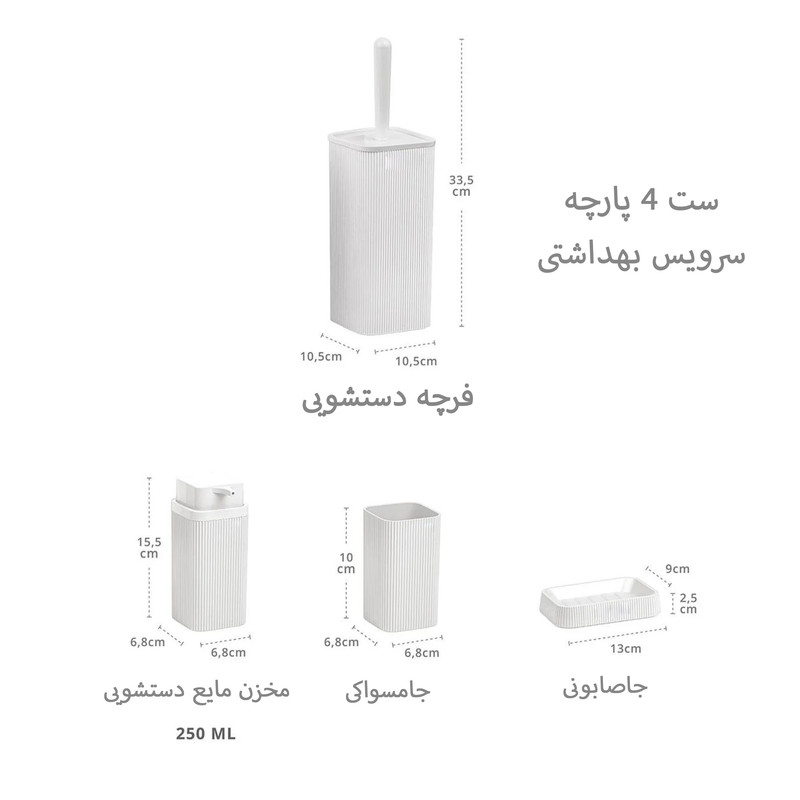 سایر توضیحات : مبدا کالا : کشور ترکیه 4 پارچه شامل فرچه دستشویی_جا مسواکی_جا صابونی_مخزن مایع دستشویی