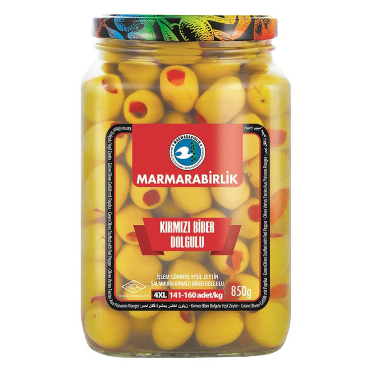 زیتون سبز با مغز فلفل - محصول کشور : ترکیه - برند : مارمارابیرلیک - بدون هسته - وزن : 850 گرم - زیتون سبز با مغز فلفل : این زیتون ها که به روشی تهیه می شوند که با عطر شدید خود طعمی فراموش نشدنی را در کام به جای می گذارند