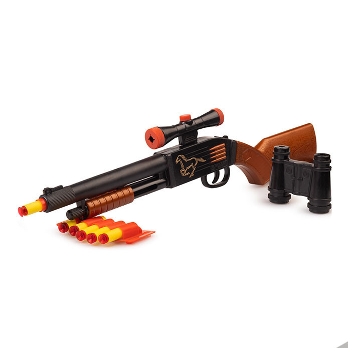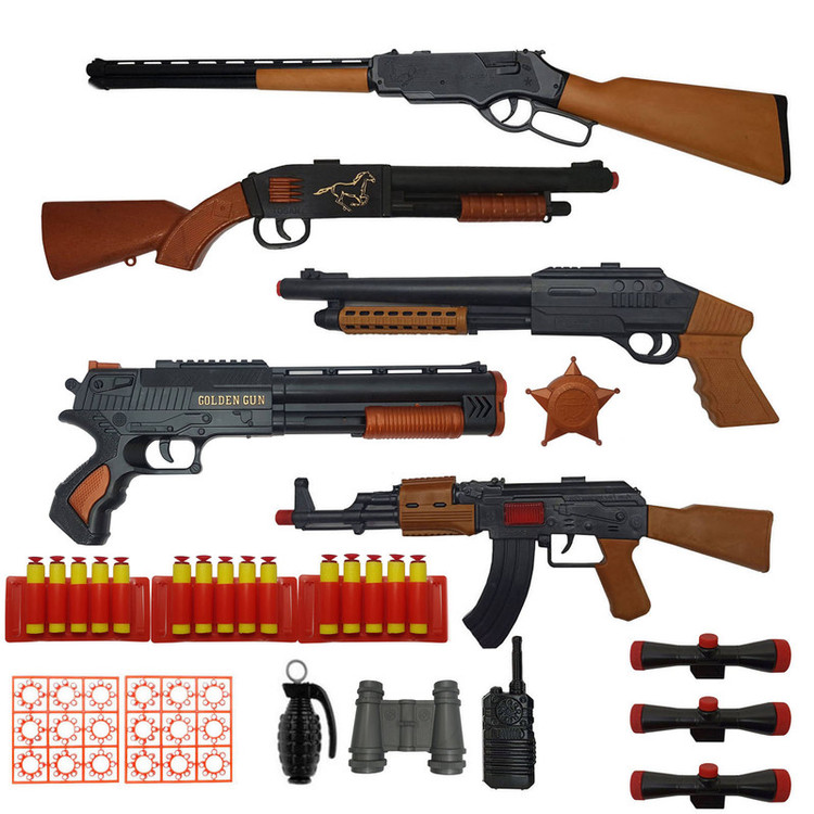 -15عدد تیر فومی قابل چسبیدن به سطوح -18 حلقه تیر ترقه ای -دو دوربین ریلی قابل نصب بر روی تفنگ -بی سیم پلیسی -دوربین شکاری - بند مخصوص تفنگ کلاشنیکف -بند مخصوص تفنگ شکاری