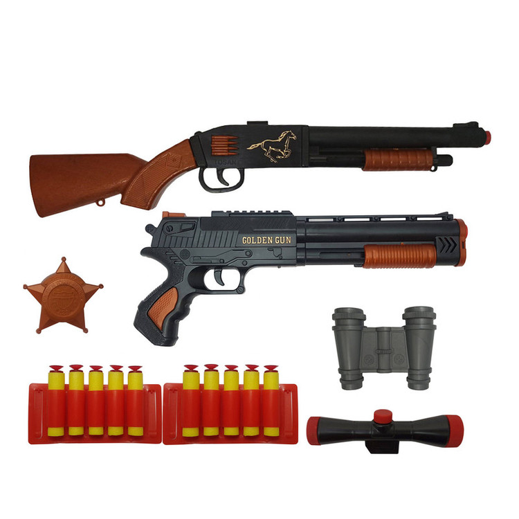 -10 عدد تیر فومی با پرتاب قوی و بی خطر -دوربین مخصوص تفنگ با نصب ریلی -دوربین شکاری -نشان کلانتر قابل الصاق به سینه -بند دوشی مخصوص تفنگ