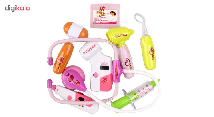 این مجموعه شامل سرنگ اسباببازی، آینهی دندانپزشکی، کارت کارکنان پزشکی. چکش پزشکی، دماسنج، گوشی طبی فشارسنج و گوشبین است. وسایل این مجموعه دارای دکمههایی هستند که با فشار دادن آنها اسباببازی از خود آهنگ و نور ساطع میکند