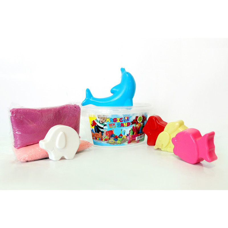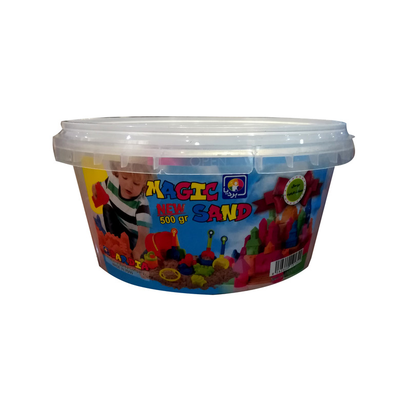 -دو بسته شن رنگی در دو رنگ به وزن مجموع 500 گرم -5 عدد قالب پلاستیکی به اشکال و رنگ ها گوناگون جهت قالب گیری شن