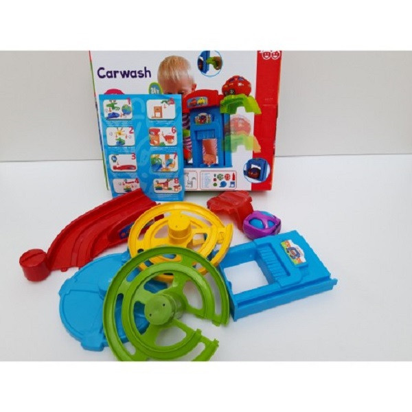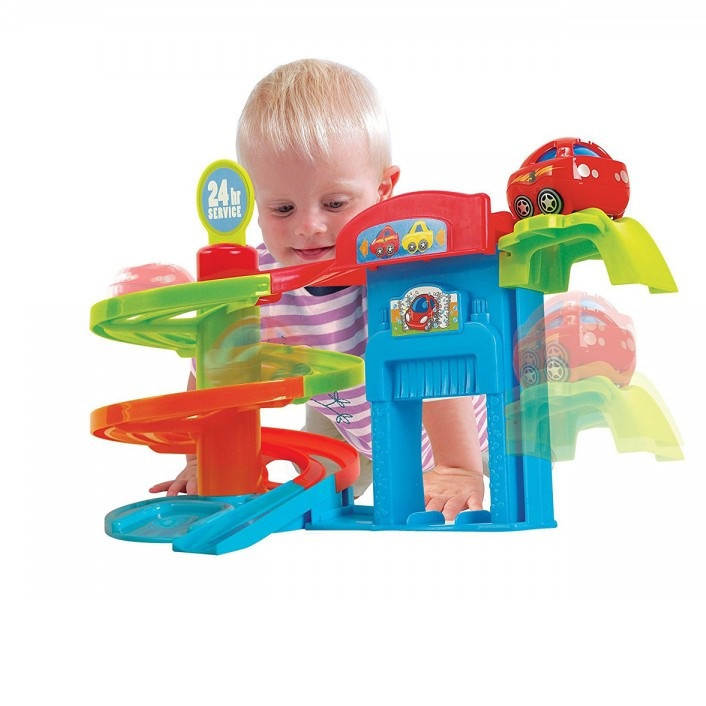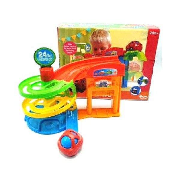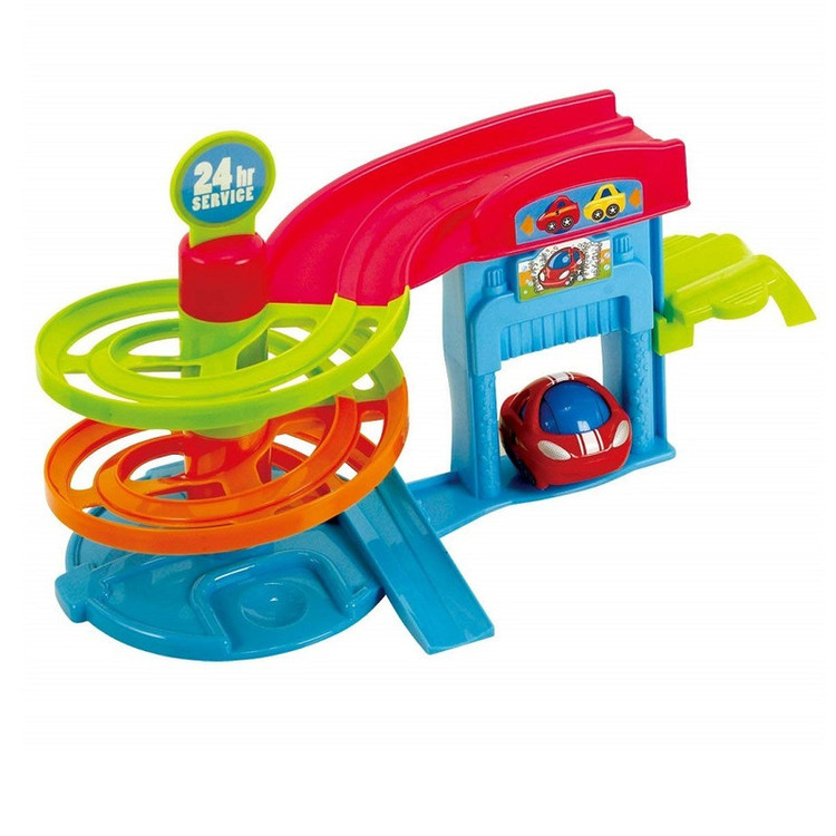 در محصول فوق یک ماشین قرار دارد که از یک گوی پلاستیکی و آبی رنگ به جای تایر استفاده کرده اند که هم ماشین به وسیله ی آن بهراحتی در مسیر مارپیچی و رنگی حرکت میکند و هم خطر بلعیدن تایرهای ماشین، کودک را تهدید نمیکند.
