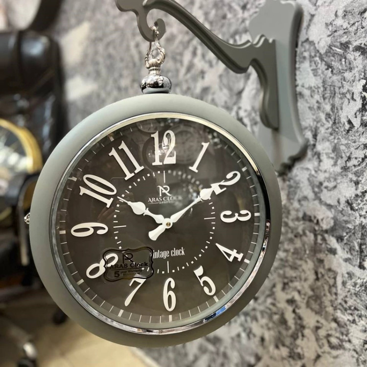 ساعت دیواری دو طرفه ارس مدل 4202، ساعت دو طرفه بسیار بینظیر عدد برجسته چوبی، تمام چوب سنگین، صفحه مشکی و رنگ طوسی