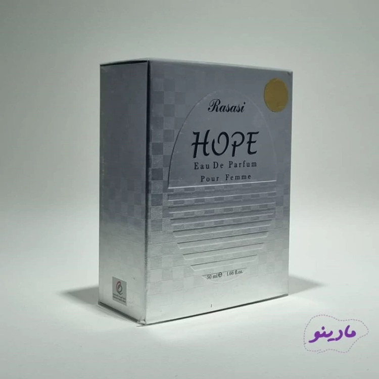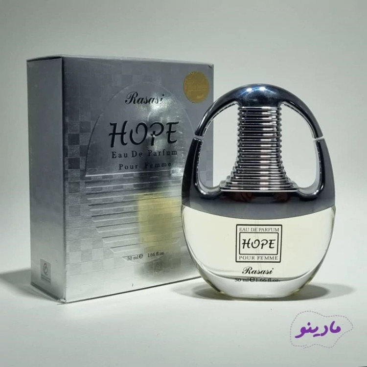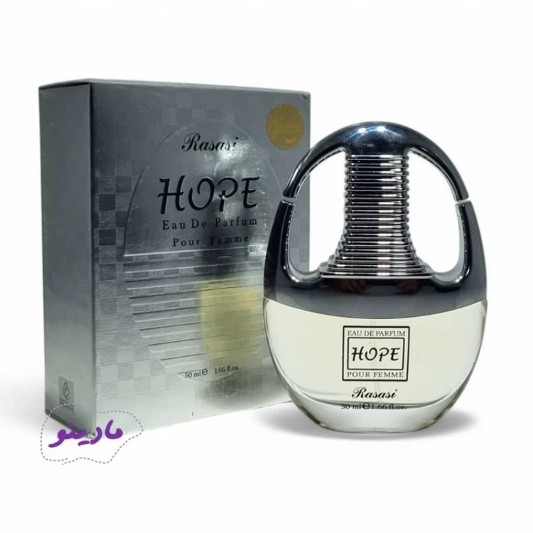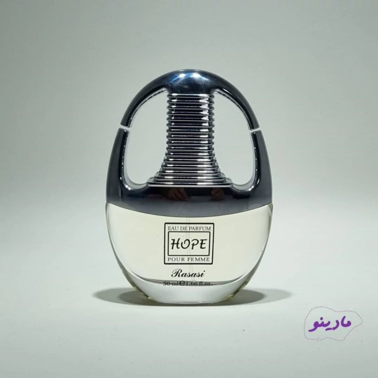 عطر ادکلن هوپ زنانه Rasasi Hope با طراحی شیشهای منحنی و مدرن با درپوش و جزئیات نقرهای، ظاهری شیک و زنانه دارد.