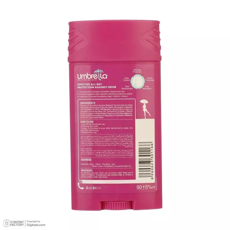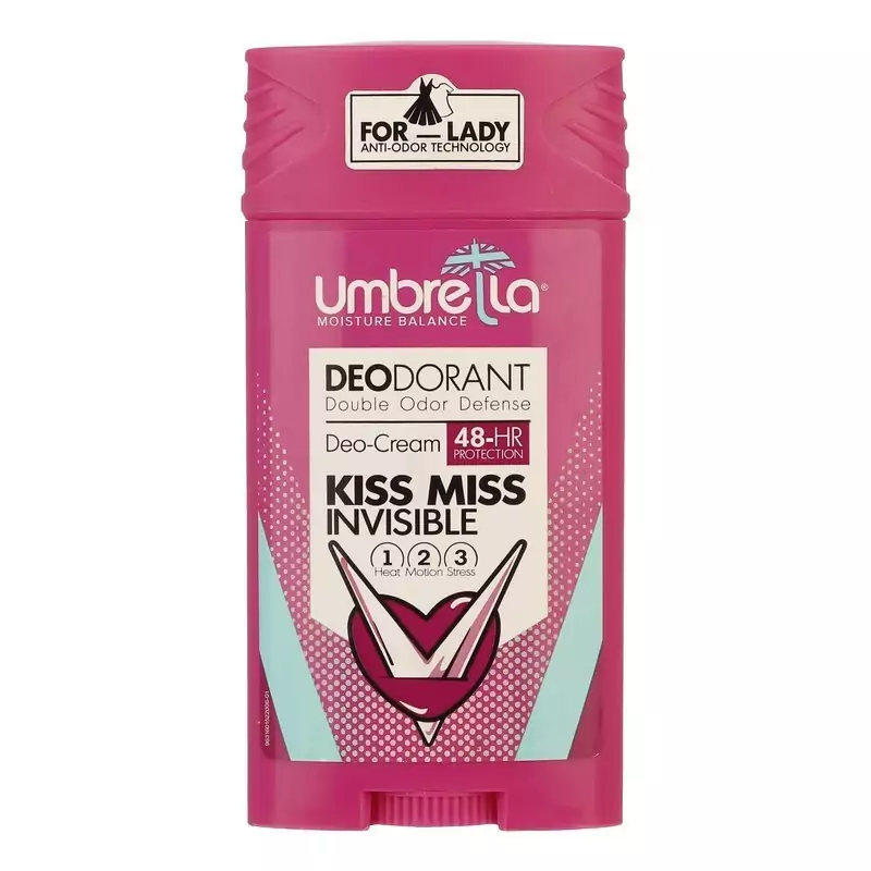 استیک زنانه آمبرلا محافظت کننده پوست در برابر تعریق وبوی نامطبوع بدن و جذب سریع که به شما این امکان را میدهد که نگران لک شدن لباس های خود نباشید .این محصول بدون ایجاد حساسیت دارای بافت کرمی با رایحه ای دلپذیر و ماندگاری بالا مناسب برای بانوان در فصل گرم می باشد.