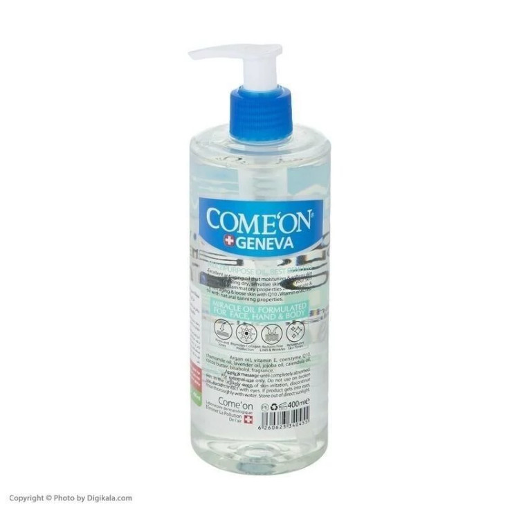 روغن بدن کامان Come`On - حاوی 6 روغن می باشد که برای تغذیه انواع پوست در هر زمانی مناسب است.روغن آرگان مرطوب کننده پوست است که موجب جوانسازی می شود، روغن بابونه موجب رفع لک، روغن کاکائو موجب تسکین سوختگی و خارش، روغن گل همیشه بهار التیام آفتاب سوختگی و روغن اسطوخودوس موجب کاهش علائم پیری می شود.