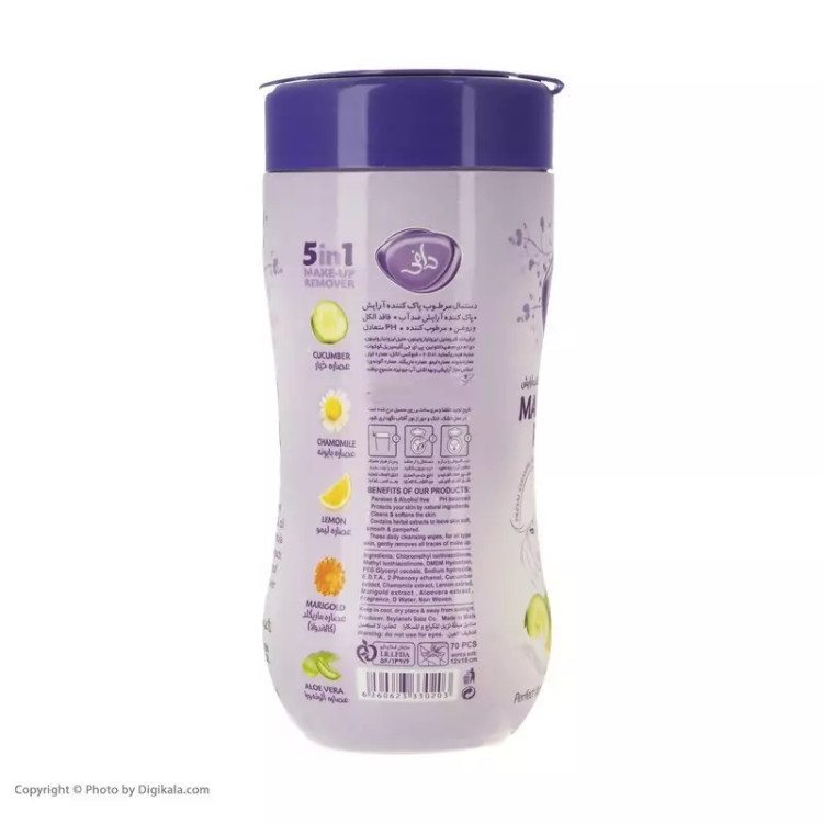 دستمال مرطوب پاک کننده آرایش دافی در بسته بندی قوطی حاوی عصاره گل همیشه بهار، عصاره بابونه، آلوئه ورا، خیار و لیمو است که به ترمیم و لطافت پوست شما کمک میکند.