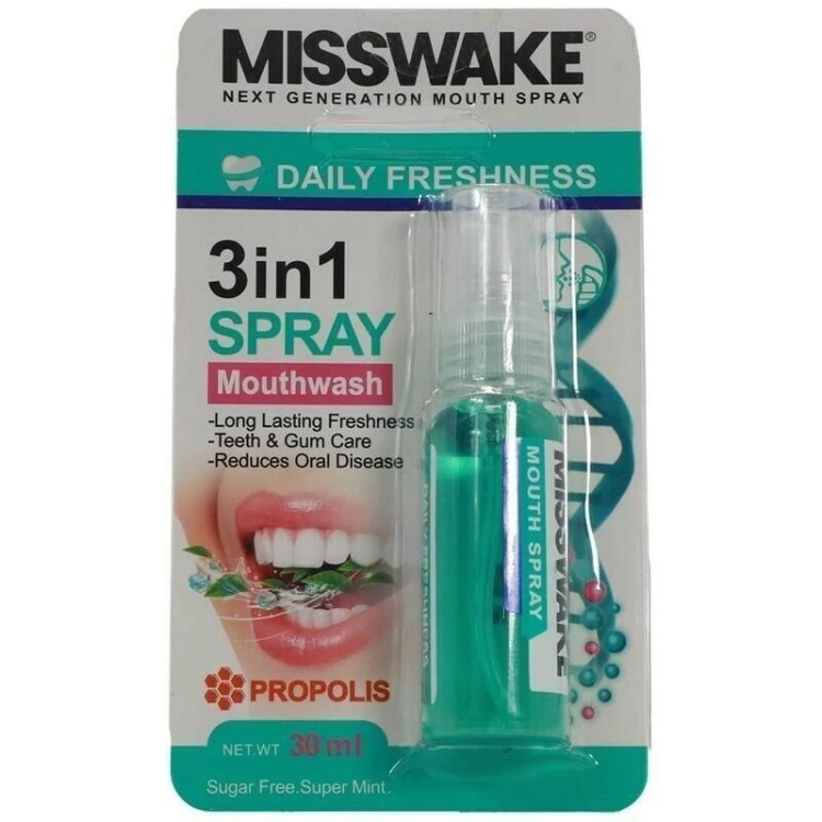 اسپری دهانشویه خوشبو کننده با طعم نعناع - Misswake میسویک، مناسب افراد سیگاری است که به محافظت از لثه می پردازد و برای استفاده روزانه طراحی شده است. این محصول میتواند برای مدت طولانی فضای دهان را خنک، خوشبو و تازه نگه دارد و از ایجاد مشکلات دهان، دندان و لثه جلوگیری نماید. همچنین به منظور از بین بردن بوی نامطبوع دهان، بوی به جا مانده از غذا و بوی بد ناشی از مصرف دخانیات قابل استفاده است.