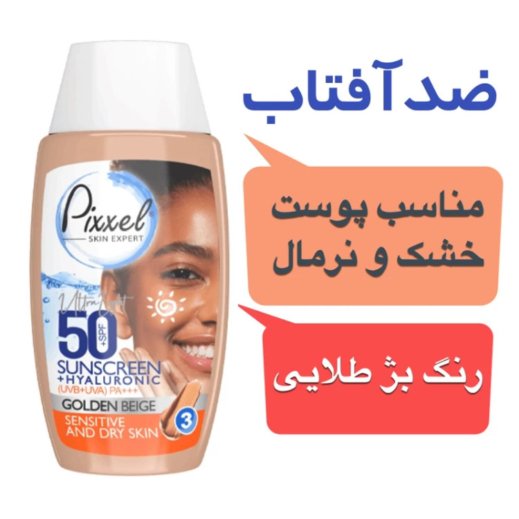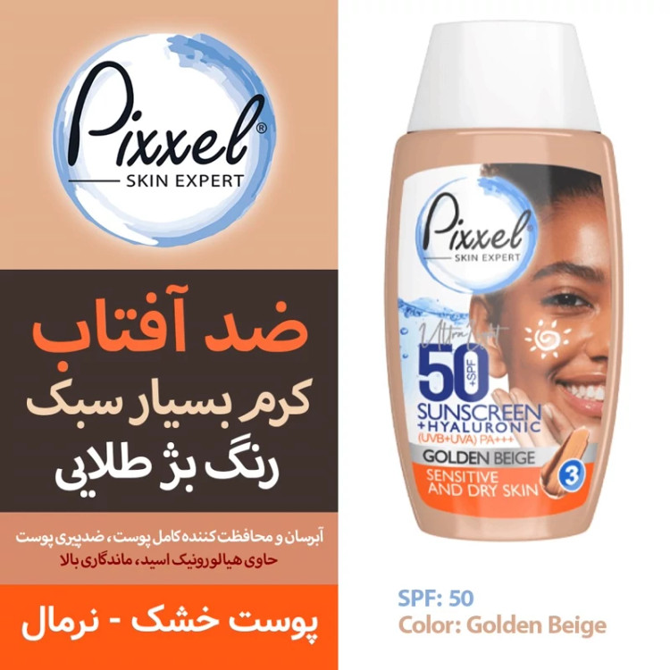 کرم ضدآفتاب پیکسل - رنگ بژ طلایی - مناسب پوست خشک و نرمال - SPF50 - حاوی هیالورونیک اسید