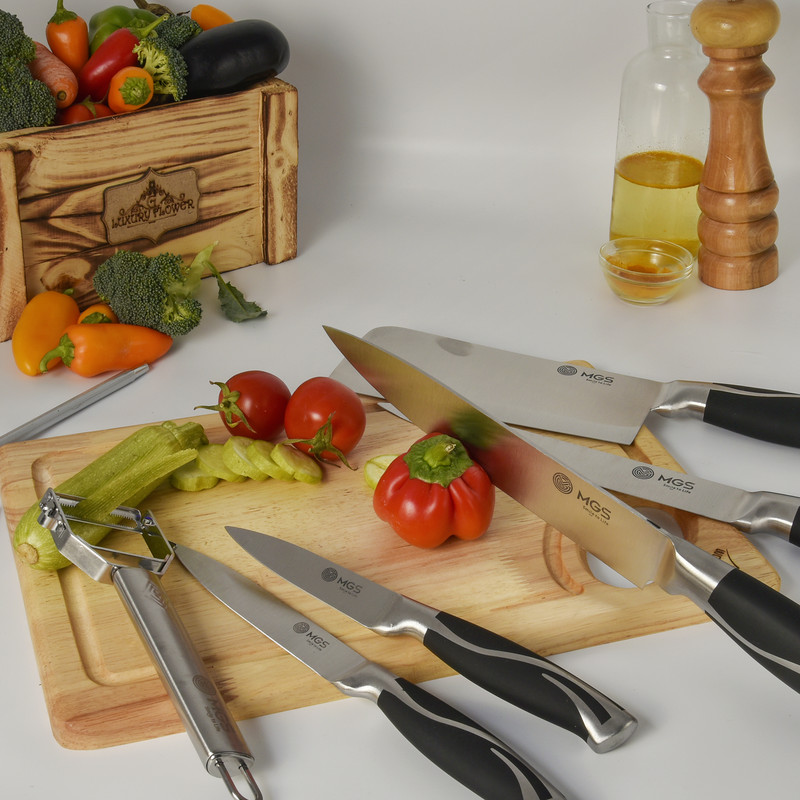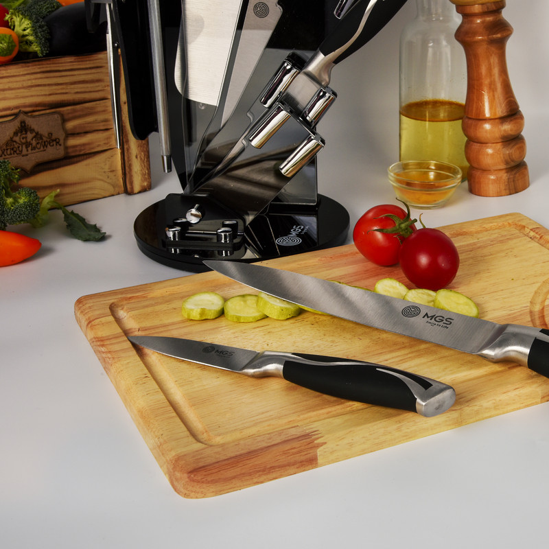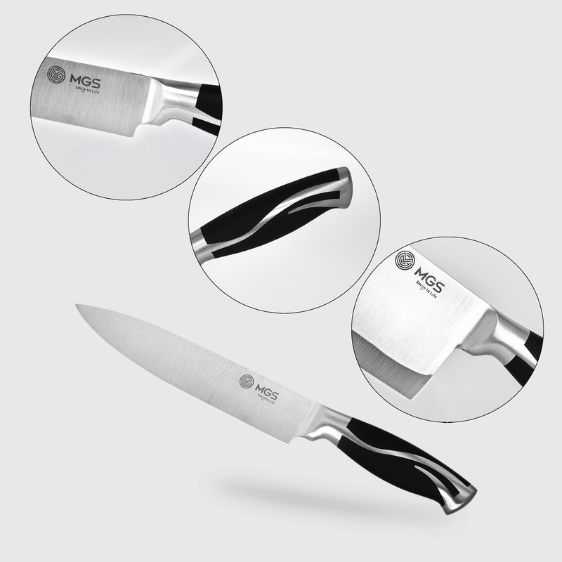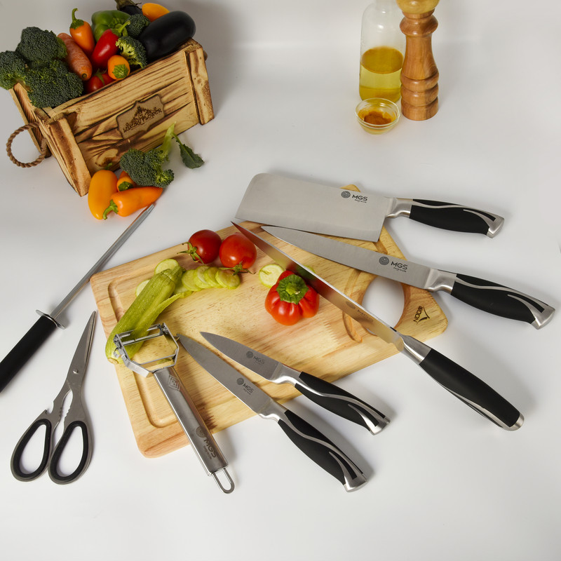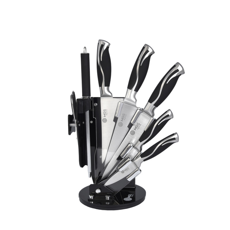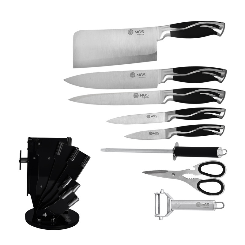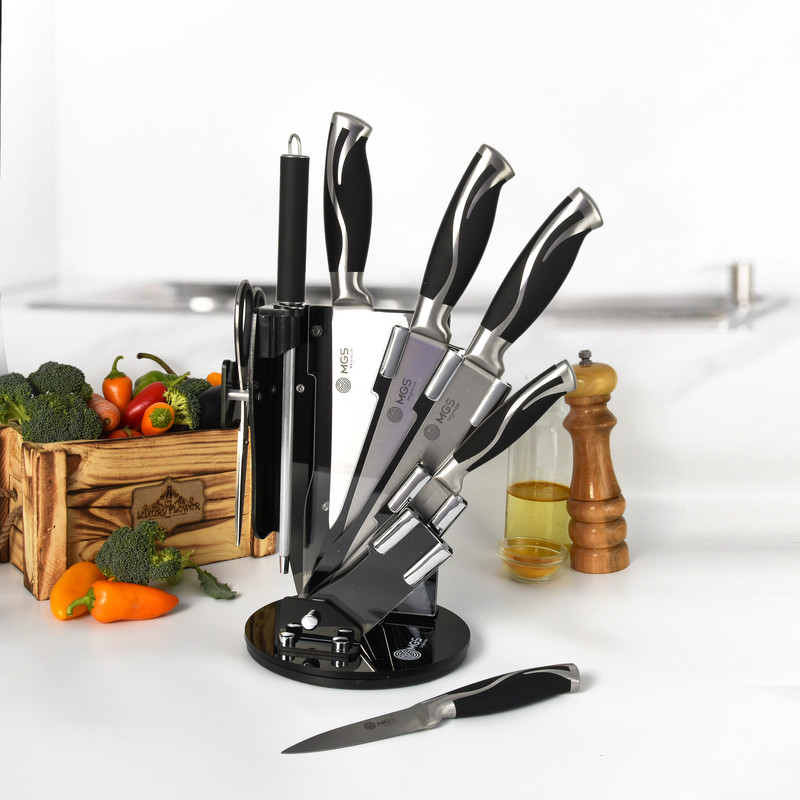 چاقو یکی از ابزارهای بسیار ضروری در آشپزخانه می باشد چرا که تکه کردن و اسلاید کردن مواد یکی از کارهای اصلی در پخت غذا محسوب می شود که ملزم استفاده از چاقو می باشد. سرویس چاقو 9 پارچه ام جی اس مدل KS-9019B از مدل های بسیار زیبا و در عین حال پر کاربرد در آشپزخانه است که مخاطبان می توانند از هر کدام از ابزارهای آن نهایت استفاده را ببرند. این سرویس چاقو یک پکیج کامل است که دارای انواع چاقو در کابرد های مختلف.قیچی آشپزخانه.چاقو تیز کن و استند نگهداره میباشد که هر کدام به نوعی در کمک کردن به مخاطب در کارهای آشپزخانه تاثیر می گذارند. طراحی ظاهری این محصول از جمله ویژگی های آن است که نمی توان آن را نادیده گرفت به طوری که کاربر می تواند آن را در هر جای آشپزخانه قرار دهد و جذابیت خاصی را به محیط خود ببخشد.همچنین این محصول از استیل ضد زنگ 18/10 ساخته شده است که مادگاری بسیار بالایی دارد