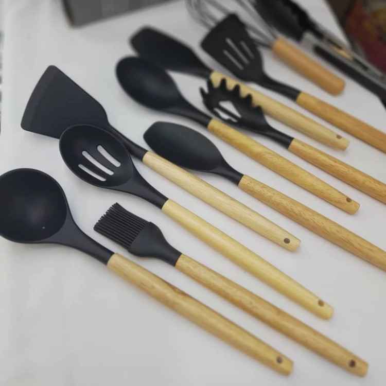ست کفگیر ملاقه و ابزار سیلیکونی دسته بامبو 12 پارچه :